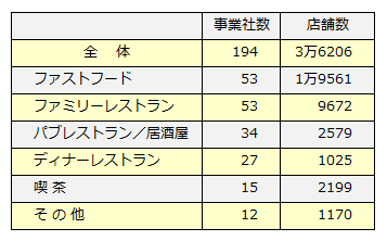 店舗数はファストフードが1万9561店で全体の約54%と半数以上を占める。2番目はファミリーレストランで9672店の27%。この2業態で8割を超える。その動向が外食産業の動向を左右している。