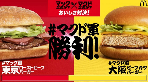 洋風をけん引したのがマクドナルドの地域対決キャンペーン。これは、8月4日~20日に、関東の「マック」と関西の「マクド」の愛称対決投票を実施したもの。「マック軍」と「マクド軍」を代表する新商品のハンバーガーを発売し、ツイッター上でツイート、リツイートの数で勝負した。集計の結果、49%対51%の僅差で「マクド軍」が勝利。マクド軍の代表バーガーがお得に食べられる「優勝セール! クーポン」を公式アプリとツイッターで配信し、話題になった。