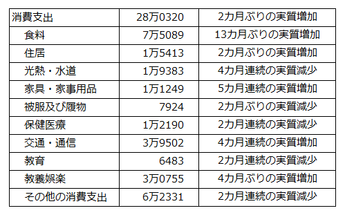 2人以上の世帯の消費支出は28万0320円。前年同月比は実質0.6%で2カ月ぶりの増加。名目は1.4%の増加、前月比(季節調整値)は実質0.2%の増加となった。