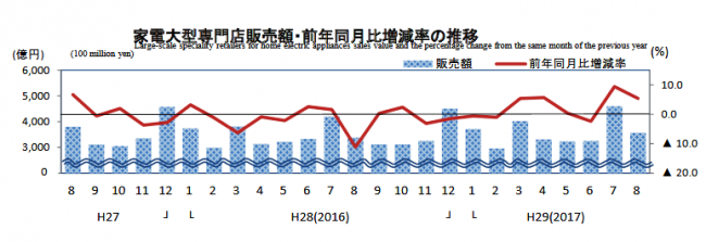 経済産業省発表の「商業動態統計速報」の8月の家電大型専門店販売額は、3567億円、前年同月比5.4%プラスとなった。