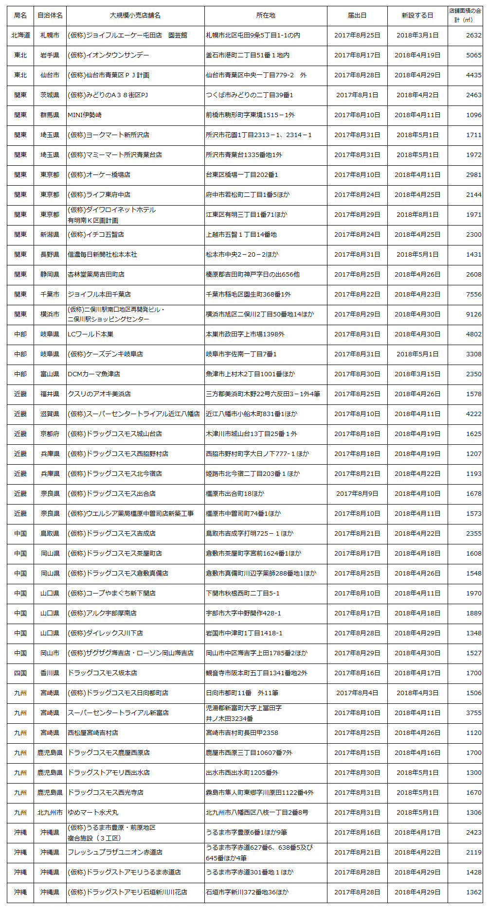 ⇒大規模小売店舗立地法(新設)届出の概要【2017年8月末】