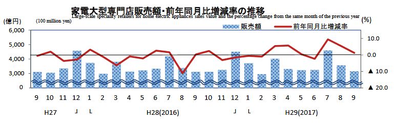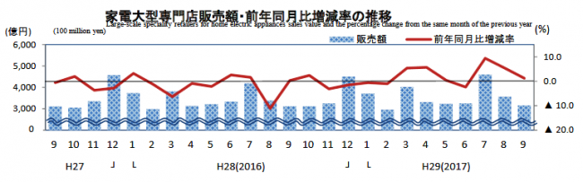 経済産業省発表の「商業動態統計速報」の9月の家電大型専門店販売額は、3158億円、前年同月比1.2%プラスとなった。