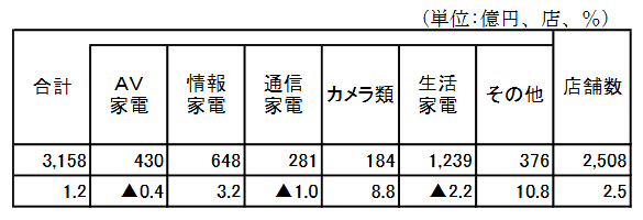 商品別の伸び率では、カメラ類8.8%、情報家電3.2%、その他10.8%と増加。マイナスは、生活家電▲2.2%、通信家電▲1.0%、AV家電▲0.4%だった。店舗数は2.5%の増えて2508店舗となった。