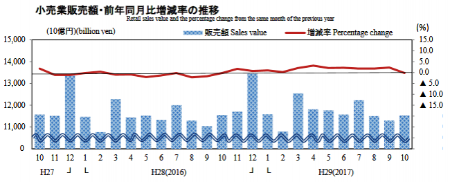 10月度の商業動態統計速報が経済産業省から発表された。この統計は、卸売業、小売業、そして業態別、商品カテゴリー別の前年同月増減率を報告する。「卸売業」と「小売業」を合わせた10月の商業販売額は37兆8430億円で、前年比3.3%増、季節調整済みでは1.7%増加した。