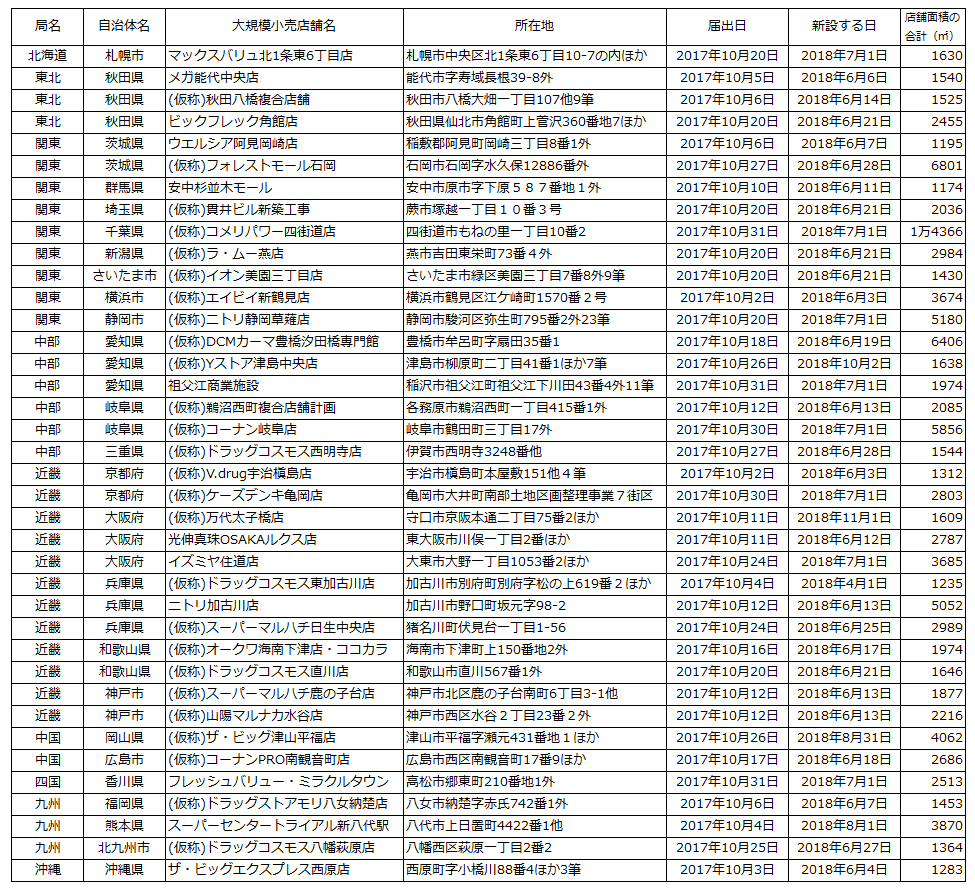 ⇒大規模小売店舗立地法(新設)届出の概要【2017年10月末】