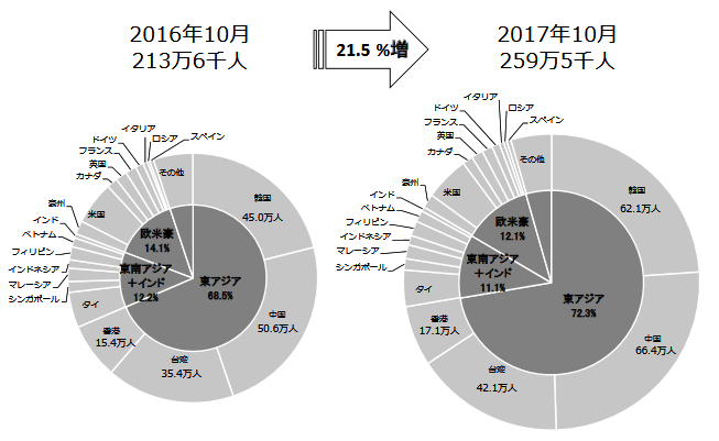 日本政府観光局(JNTO)から10月の訪日外客数が発表された。訪日外客数は259万5000人で21.5%増、2016年10月の213万6000人を約46万人上回り、10月として過去最高となった。