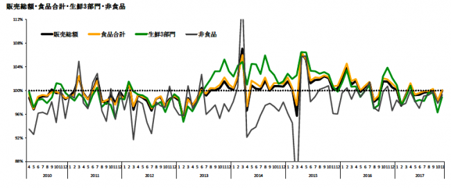 「11月スーパーマーケット販売統計調査」が発表された。これは、日本スーパーマーケット協会(JSA)、オール日本スーパーマーケット協会(AJS)、新日本スーパーマーケット協会(NSAJ)3団体の合同調査による。調査対象企業は全国の270社。