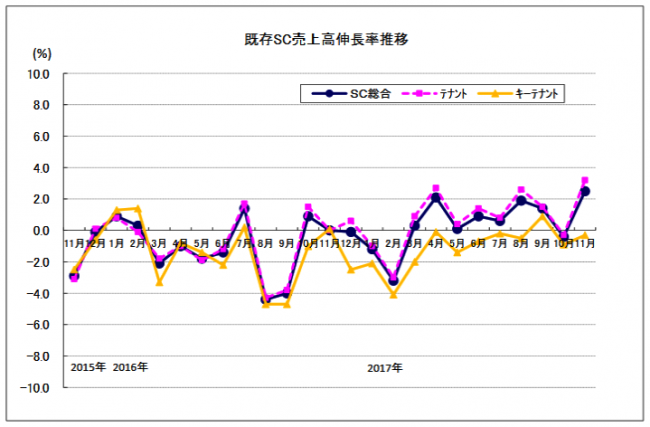 11月の「ショッピングセンター(SC)販売統計調査」が、一般社団法人日本ショッピングセンター協会から発表された。サンプル数は501施設。