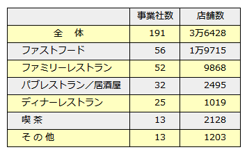 11月の回答事業者は191社で店舗数は3万6428店。10月に比べると事業社数は8社、店舗数は707店増加した。店舗数はファストフードが1万9715店で全体の約54%を占める。2番目はファミリーレストランで9868店の27%。合わせて8割を超えるこの2業態の動向が、外食産業に大きな影響を及ぼす。