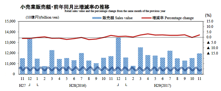 11月度の商業動態統計速報が経済産業省から発表された。この統計は、卸売業、小売業、そして業態別、商品カテゴリー別の前年同月増減率を報告する。「卸売業」と「小売業」を合わせた11月の商業販売額は39兆1610億円で、前年比4.6%増、季節調整済みでは2.1%増加した。