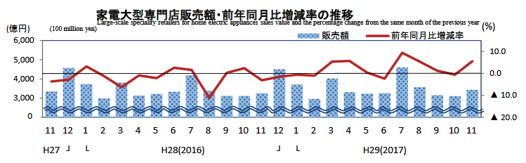経済産業省発表の「商業動態統計速報」によれば、11月の家電大型専門店販売額は3436億円で、前年同月に比べて5.6%増加した。