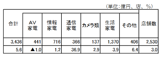 カテゴリー別にみると、「通信家電」が36.9%と驚異の伸び率。携帯電話機などが売上げを伸ばした。「その他」6.4%、「生活家電」3.9%、「カメラ類」2.9%、「情報家電」1.2%と続く。唯一「AV家電」だけが▲1.0%。店舗数は3.0%増加し2530店舗となった。