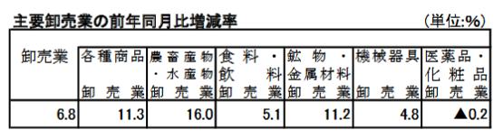 卸売業の販売額は、29兆7950億円で6.8%プラス(季節調整済1.9%増)。農畜産物・水産物卸売業16.0%をはじめ、どの業種も好調に推移した。なかでも大規模卸売店の販売額は11兆0253億円で6.9%前年を上回った。ただし、医薬品・化粧品卸売業だけがマイナスとなった。
