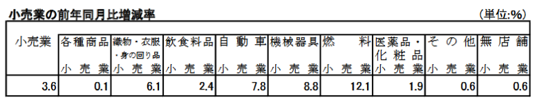 小売業の販売額は13兆9460億円で3.6%増、季節調整済みでも0.9%の増加だった。商品別に見ると燃料の12.1%をはじめ、すべての業種項目でプラスとなった。