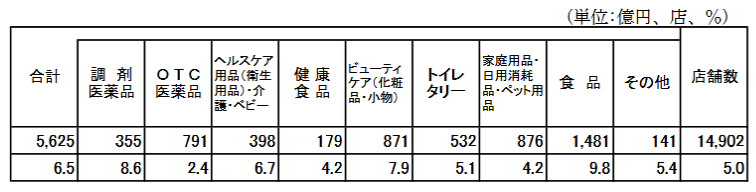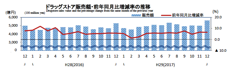 経済産業省発表の「商業動態統計速報」によれば、12月のドラッグストア販売額は5625億円で、前年同月を6.5%上回った。