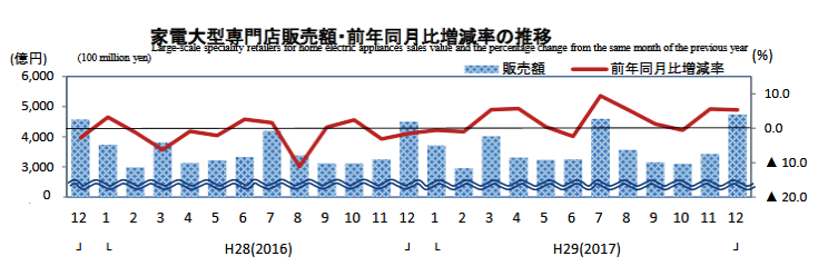 経済産業省発表の「商業動態統計速報」によれば、12月の家電大型専門店販売額は4748億円で、前年同月に比べて5.3%増加した。