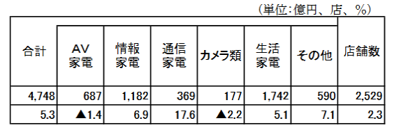 カテゴリー別に見ると、携帯電話などの「通信家電」が17.6%と二桁増。次に「その他」の7.1%。「その他」には温水洗浄便器、火災警報器、照明器具、電池などが含まれる。続いて「情報家電」6.9%、「生活家電」5.1%。一方、前年に届かなかったのは「カメラ類」▲2.2%、「AV家電」▲1.4%。店舗数は2.3%増加し、2529店舗となった。
