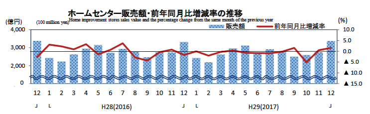 経済産業省発表の「商業動態統計速報」によると、12月のホームセンター販売額は3371億円で、前年同月比1.6%の増加だった。