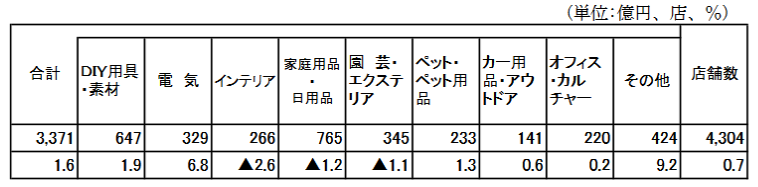 伸び率が高いのは「その他」で9.2%。衣料品、食品、飲料、酒類、薬品、灯油、タバコなどの売上げがこれに含まれる。続いて「電気」6.8%、「DIY用具・素材」1.9%、「ペット・ペット用品」1.3%、「カー用品・アウトドア」0.6%、「オフィス・カルチャー」0.2%。一方マイナスは「インテリア」▲2.6%、「家庭用品・日用品」▲1.2%、「園芸・エクステリア」▲1.1%の3項目。