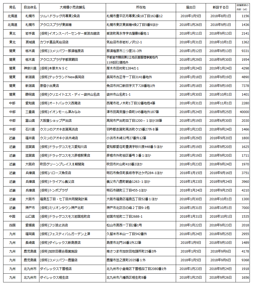 ⇒大規模小売店舗立地法(新設)届出の概要【2018年1月末】