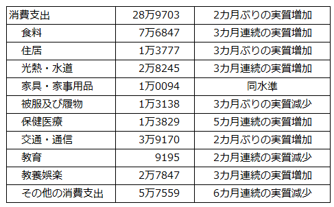 2人以上の勤労者世帯の実収入を見ると、1世帯当たり44万2129円。前年同月比では実質1.5%減で8カ月ぶりにマイナス。名目では0.2%増加した。消費支出は31万7659円で実質1.7%増と、2カ月ぶりの増加となった。