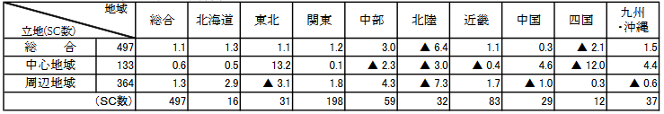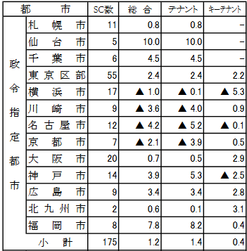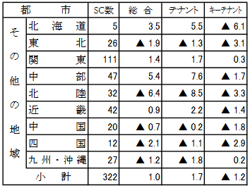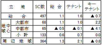 立地別・構成別売上伸長率を見ると、「中心地域の中都市」はテナント・キーテナントともマイナスで苦戦。一方で大都市は好調だった。周辺都市はキーテナントが前年を下回ったが、テナントが2.1%だったことで全体では前年を上回った。