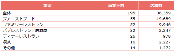 一般社団法人日本フードサービス協会(JF)が「2月の外食産業市場動向調査」を発表した。業態別に集計したこの調査は、新店を含めた全店を対象にしている。2月末時点で、調査対象は195社、店舗数3万6359店。1月に比べて事業社は3社増え、店舗は162店増加した。