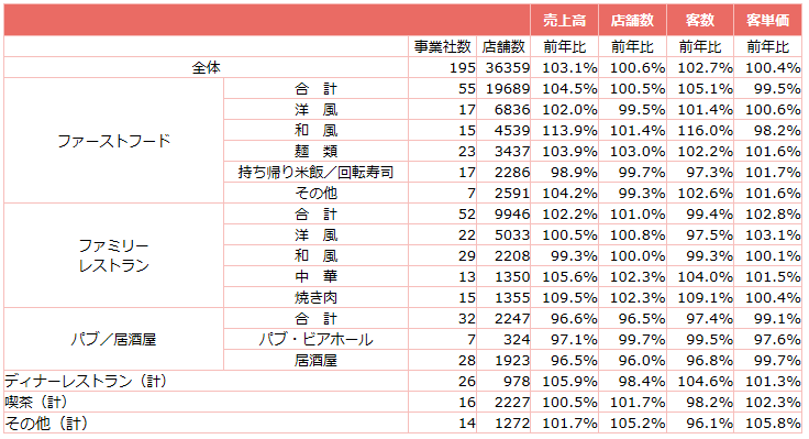 売上高を前年比伸び率順に並べると、ディナーレストラン5.9%、ファストフード4.5%、ファミリーレストラン2.2%、喫茶0.5%が増収。一方、パブ・ビアホールは客数が伸び悩み▲2.9%、居酒屋は店舗数減少が響き▲3.5%と前年に届かなかった。