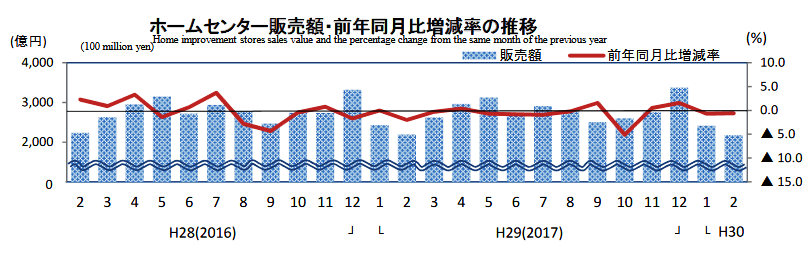 経済産業省発表の「商業動態統計速報」によれば、2月のホームセンター販売額は2175億円で、前年同月比0.6%の減少だった。店舗数は0.8%増加し、4296店舗となった。