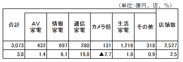 カテゴリー別に見ると「カメラ類」だけが2.7%の減少で、ほかの5項目はプラスとなった。「通信家電」は19.8%と大幅な伸びだ。それに「情報家電」の6.1%が続く。「生活家電」1.8%、「AV家電」1.4%、「その他」0.9%。