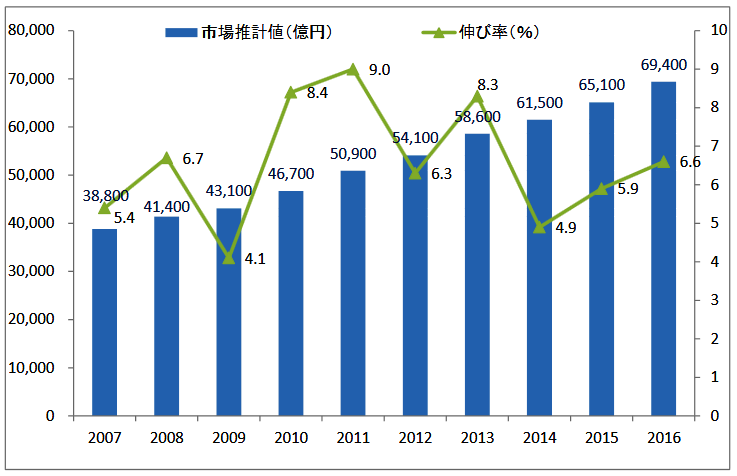 協会では、一昨年の1年間の売上調査をこの時期に発表する。2016年度(2016年4月~2017年3月)の売上高調査の結果は、6兆9400億円。2015年度と比較して4300億円増加し、6.6%前年を上回った。1998年度以来18年連続で増加傾向。直近10年の平均成長率は6.6%となっている。