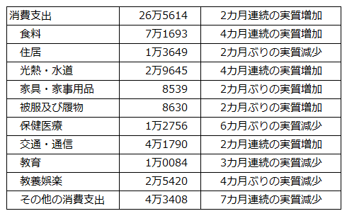 2人以上の世帯の消費支出は26万5614円。前年同月比は、物価変動の影響を除いた値「実質」は0.1%増加で2カ月連続。そのままの値「名目」では1.9%増加した。また前月比(季節調整値)は1.5%減少した。