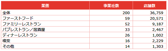 一般社団法人日本フードサービス協会(JF)が「3月の外食産業市場動向調査」を発表した。業態別に集計したこの調査は、新店を含めた全店を対象にしている。3月末時点で、調査対象は200社、店舗数3万6359店。2月に比べて事業社は5社増え、店舗は400店増加した。