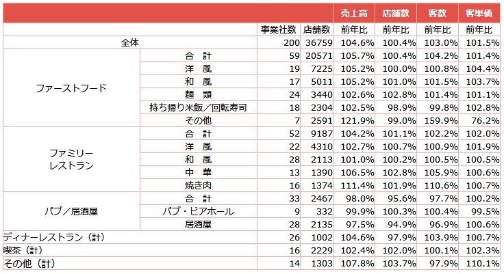 売上高を前年比伸び率順に並べると、ファストフード5.7%、ディナーレストラン4.6%、ファミリーレストラン4.2%、喫茶2.4%と前年超え。一方、店舗数減少の影響を受け、居酒屋とパブ・ビアホールは前年を下回った。