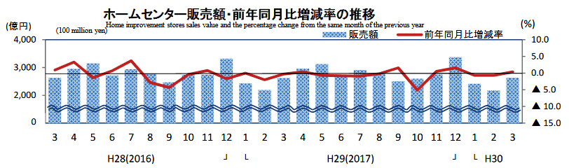経済産業省発表の「商業動態統計速報」によれば、3月のホームセンター販売額は2634億円で、前年同月比0.4%とプラスとなった。店舗数は0.8%増加し、4306店舗。