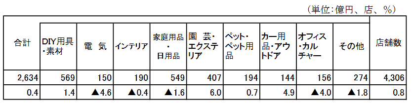 3月は「園芸・エクステリア」6.0%、「カー用品・アウトドア」4.9%など4項目がプラス。一方減少したのは、「電気」▲4.6%、「オフィス・カルチャー」▲4.0%を含む5項目だった。店舗数は4306店で0.8%の伸び。