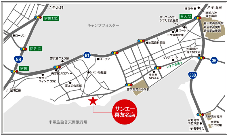 宜野湾市は、沖縄本島中南部の東シナ海に面しており、那覇市から北へ約12Kmの地点。市内を国道58号線と国道330号線が通り、さらに沖縄自動車道のインターチェンジへのアクセスも良く、交通量も多い。サンエーのおひざ元だけに多くの顧客が見込まれる。