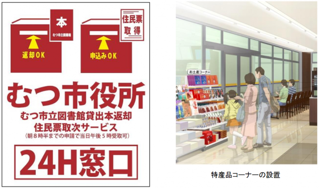 「住民票取次サービス」や「市政パンレットの配布」、観光客への「観光案内」、むつ市立図書館の「貸出本返却サービス」などを行う。また、むつ市への「意見箱」も設置する。さらにイートインコーナーを活用して、健康相談会や国際交流トーキングイベントなど、むつ市とともに定期的なイベントを開催する。行政と連携したこれらの取り組みは、ミニストップとしては初の試みとなる。