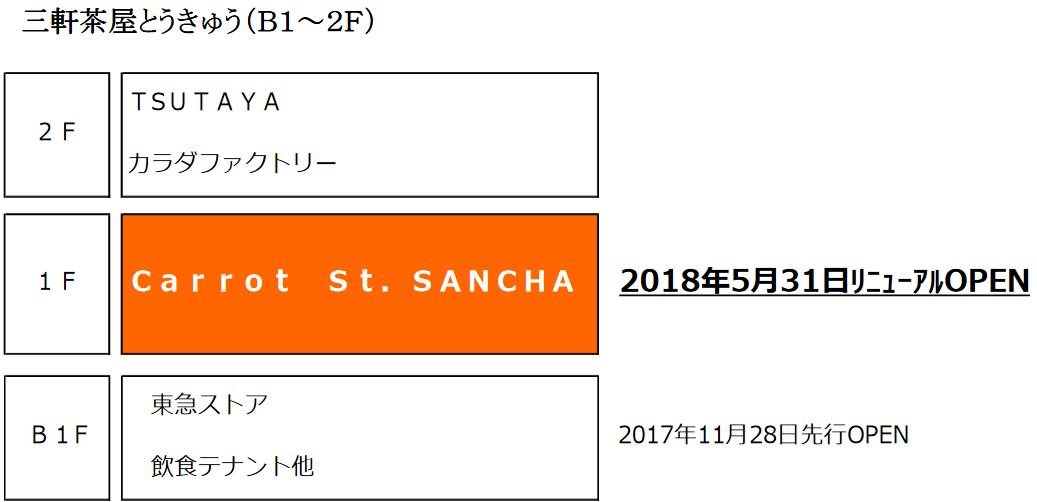 2017年11月に先行オープンした地下1階の東急ストアはデリやグロサリーなどの売場を中心に改装している。「Carrot St.SANCHA(キャロットストリートサンチャ)」改装をもって全3層がグランドオープンとなる。