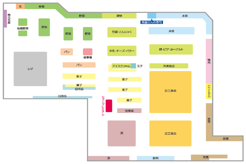 改装では、地元名産コーナーを新設する。また「魚屋さんの寿司」コーナーを拡充する。品揃えでは、地産地消、個食、簡便、健康志向などを切り口にした商品の充実を図る。
