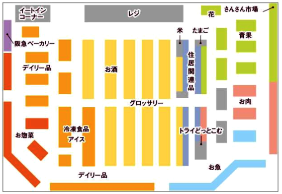 惣菜は、高齢者や単身者向けの小量パックの品揃えを充実させる。ベーカリー売場は「阪急ベーカリー」を導入。加工食品は、30~40代のファミリー対応の菓子を多数取り揃え、子ども向けの売場づくりを行う。また、仕事帰りの顧客向けには、チューハイなど人気の高アルコール系から手軽に楽しめる低アルコール系まで酒類も幅広く用意する。日配売場ではファミリー層向けの弁当、週末のまとめ買いを考慮して、冷凍食品を拡大する。日用品は、消耗品をはじめペット用品も充実させた。