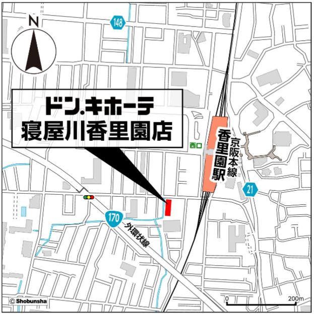 出店するのは京阪本線・香里園駅の南側300m、徒歩4分ほどの場所で、パチンコホールの跡地だ。駅への生活動線上に立地する。また近隣にはグループ店舗の「ドン・キホーテ高槻店」や「ドン・キホーテ枚方店」がある。