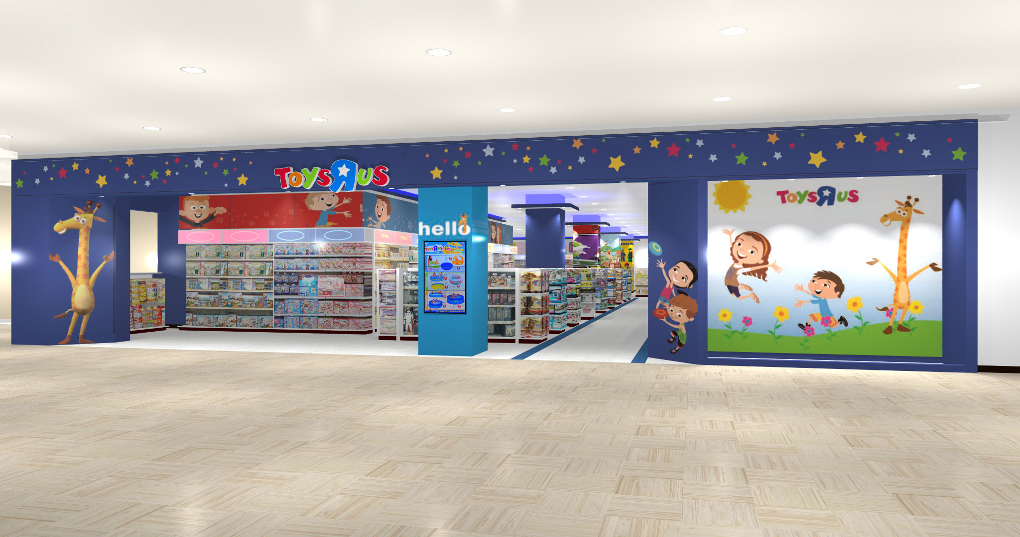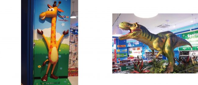 店舗のインテリアはトイザらスのブランドカラーであるブルーを基調にしてまとめる。その店内にトイザらスの公式キャラクター “ジェフリー” のフォトスポットや動く “ティラノサウルス” の模型を設置して、子どもがワクワクするような楽しいショッピング空間を演出する。