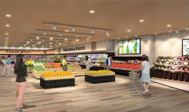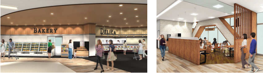リニューアルでは駅前立地に合わせて、インストアベーカリーの「ブレッチェン」や休憩スペース「くつろぎ広場」、食の情報発信の場となる「キッチンスマイル」など最新の売場や機能を導入する。
