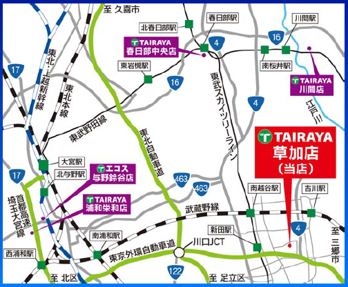 周辺にはエコスグループの店舗として、TAIRAYA春日部中央店、TAIRAYA川間店、TAIRAYA浦和栄和店、エコス与野鈴谷店がある。