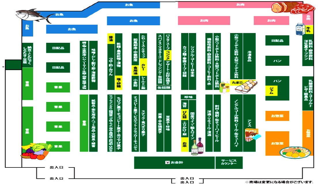 改装に際して、売場は買い回りしやすいレイアウトに変えられた。出入口は店舗左サイドと正面の2カ所とした。左から入ると、青果、和日配、そして正面奥突き当たりに鮮魚、精肉が壁面沿いに配置されている。そして店舗右翼にはパン、乳製品の洋日配、冷凍食品、最後に惣菜を置いた。レジ前に最後に購入してもらう酒と飲料の売場を設けている。