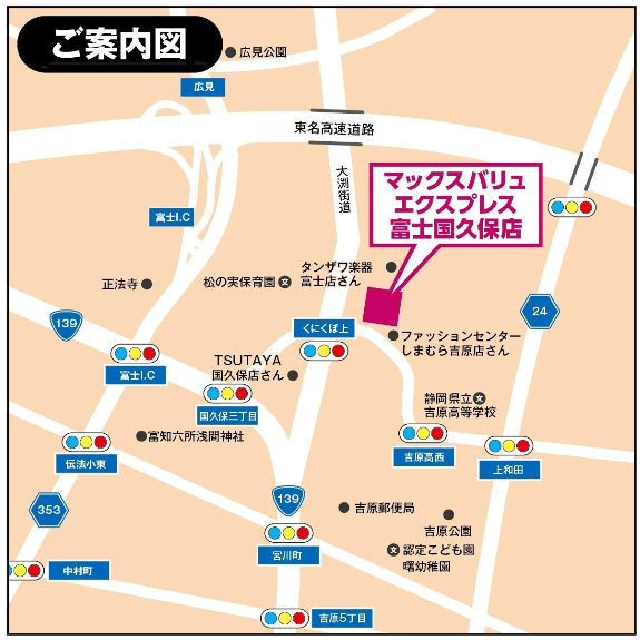 同店は、東名高速道路・富士ICから直線距離で東へ約750m、地域の生活道路である大渕街道「くにくぼ上」交差点近くに出店する。