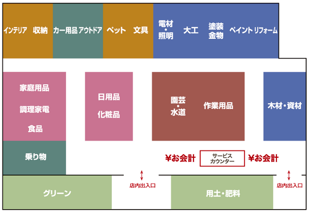 取り扱い商品は、大工道具、建築金物、建築資材、補修用品、園芸用品、グリーン エクステリア、ペット用品、カー用品、乗り物、家庭用品、日用雑貨、オフィス用品、インテリア 寝具、収納用品、家庭用電器、小物家具など。有料サービスとして、商品配達や商品の組み立て、表札、名入れ加工、電動工具・家電等の修理、木材・資材カットを行う。また、物置、外柵・門扉、カーポート、ハウス・勉強部屋等の小住宅の工事や、畳の張り替えなど住まいに関する工事等も行う。店内には、無料介護車も備えている