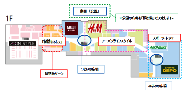 その一方で、メインターゲットになる子育て世代を意識した取り組みも強化する。モール東側には、子どもたちが集まる賑わいの場として、大型滑り台などの遊具や芝生広場のある公園を整備する。また3Fのキッズゾーン内には、座って本が楽しめる「えほんの広場」を設置。そのほか、イオンスタイル豊田で好評を得た乳児用の座席を配置したフードコートや、子ども用トイレ、ベビーパーキングなど、ベビー・キッズ連れのファミリー層に配慮した施設づくりをする。