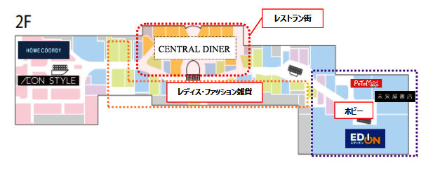 2階のサブ核店舗は、家電のエディオンと未来屋書店。中央には、レストラン街「セントラルダイナー」を配置する。和食、洋食、中華、イタリアンなど14店舗が揃う。2階には、レディスファッションや雑貨の専門店が出店する。